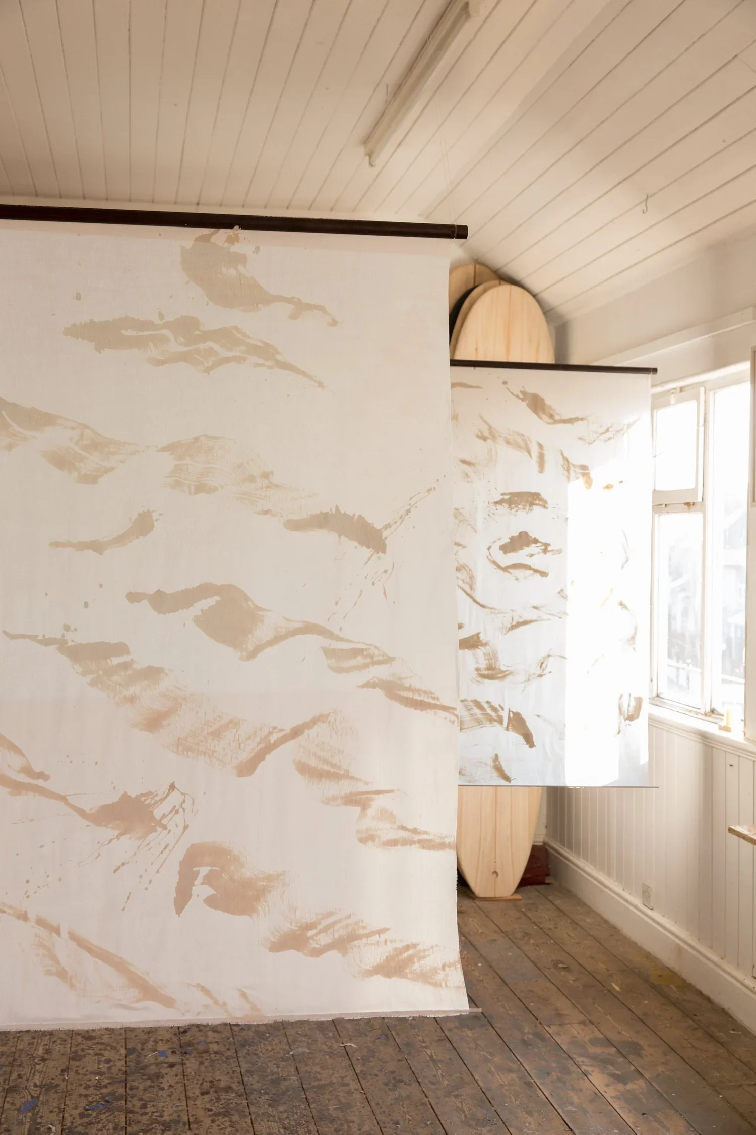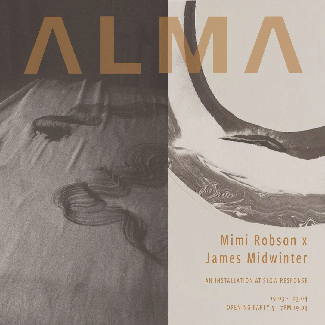 Their collaboration with ALMA consists of several works on paper, as well as fabric hangings by Mimi, and a video installation by James.